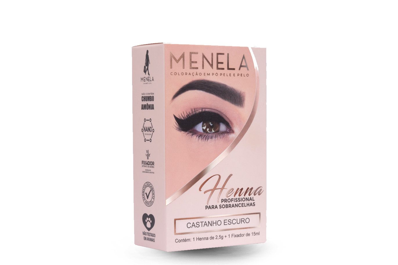 A Henna para Sobrancelhas Menela Castanho Médio tem em sua composição, extrato da planta Lawsonia inermes (henna), e micro partículas (nanotecnologia) com princípios ativos capazes de penetrar as camadas da pele, de maneira mais profunda, potencializando de forma mais rápida e eficaz a coloração do pelo e da pele.